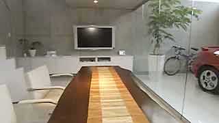 | 非常に画になるコンクリート打ち放しの堅牢な建物です。ともすれば壁が多いと圧迫感が感じられてしまうところですが、ガラスを使うことで「抜け」があります。この「抜け」が軽快感を生み出しているんですね。何よりもどこからでも愛車を眺めることができるという考え抜かれた設計。建物づくりの面白さがたくさんつまったお宅です。 |