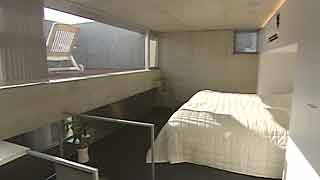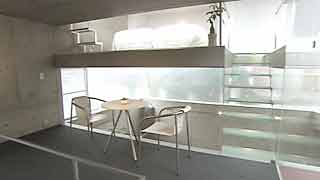 透明の階段を上ると、寝室と書斎。ここからは、半階上の屋上テラスが見渡せます。書斎はカフェのようにと希望した奥さんのこだわりの空間です。 |