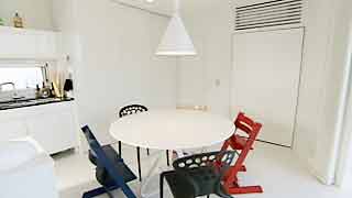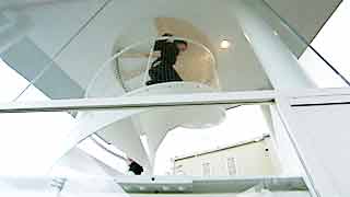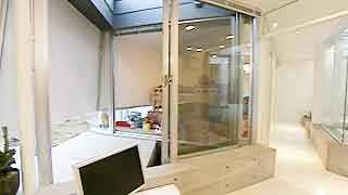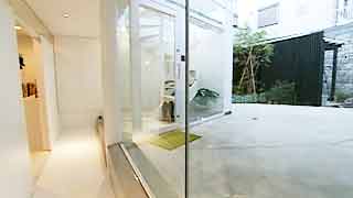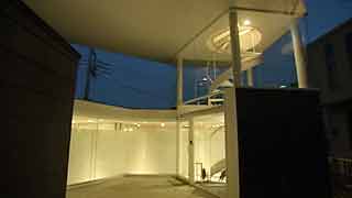 | 住宅地に立つモダンな建物です。与えられた条件の中で最大限の快適さを獲得する、そんな挑戦心を感じます。 家の脇の階段を昇ると、いきなり回廊に囲まれた中庭に入ります。プライバシーを守りつつも開放感が得られる間取りです。そして、空中に飛び出すような螺旋階段を昇ると、そこは宙に浮いた約30畳のLDK。夢を運ぶ船あるいは宇宙船のようにも見えます。 |