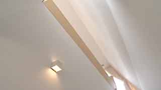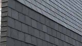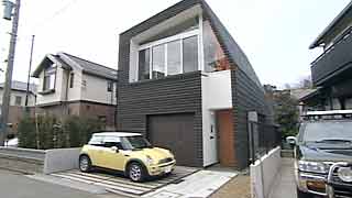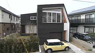 開口をほぼ東西に限定。個性的な角度の屋根。天然スレートの屋根材でくるんだような外観。全て、近隣に配慮した結果生まれた、奥ゆかしいデザインです。 |