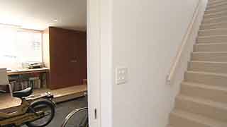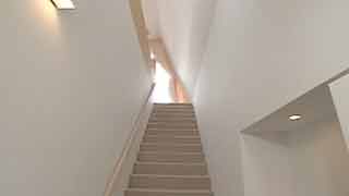 玄関に入るとすぐ階段。約1.2mと幅が広く、光に導かれて自然に2階へと足が向かいます。カーペット貼りの柔らかい足触り。 |