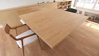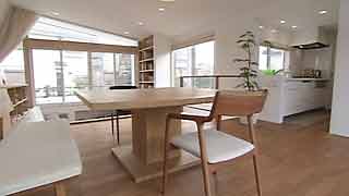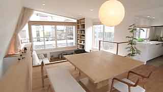 約28畳のリビングダイニング。屋根型そのままの天井が空間に広がりを与えています。1辺が1.5mの正方形の食卓は、気分に合わせて座る位置を変えて楽しめます。 |