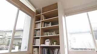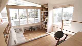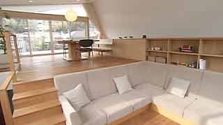 ダイニングからの視線を遮らないよう90cm下げたリビング。作り付けのソファに包まれるように寛げます。東南角の本棚は、大空間を支える構造壁を利用したものです。 |