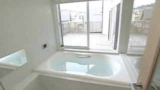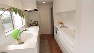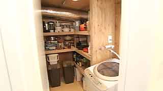 奥さんが希望した外が見えるキッチン。テラスに面した開放的なバスルーム。その両方からアクセスできる食品庫は、洗濯機も置かれ、家事動線をコンパクトにまとめています。 |