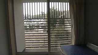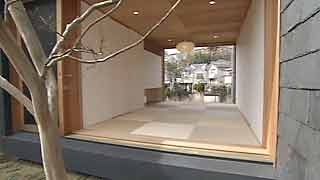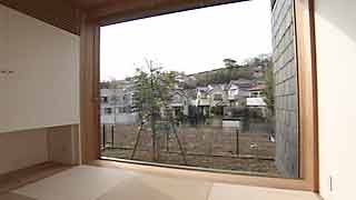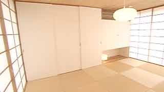 2つ目の階段を下りると約10畳の和室。東西の障子とガラス戸は全て引き込めるので、全開すると屋外との一体感が味わえます。壁は土佐和紙張りです。 |