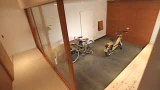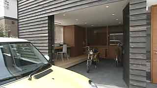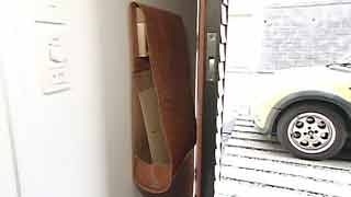車庫にもアトリエにもできる多目的な土間。玄関側にも出入り口があります。ドアが当たっても平気なようにと皮で作った郵便受けがお洒落です。 |