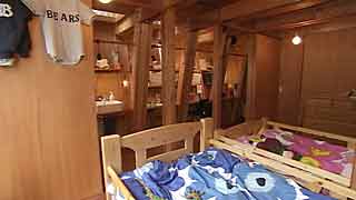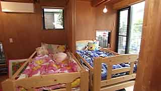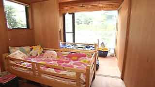 | 赤井邸の敷地は横浜に良く見られる起伏の多い住宅地の一角にあり、西側に面する緑深い幼稚園のグラウンドへと下っている。建物は近隣と隣接した左右を閉じ、木造の門型フレームによるトンネル状の空間を用意した。そしてこのフレームの一方の壁を外側へ傾かせ、各階1mピッチで連続するツーバイ材による偏芯ブレースの架構を設けた。これによって眺望の良い西側方向に対して壁をなくし、効果的に視界の抜けと空間のリズムをつくりだしている。また、できる限り装飾を排除して骨格のはっきりした空間をつくることができた。 | |||||||||||||||