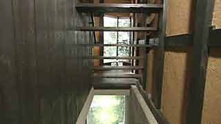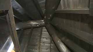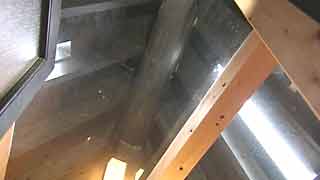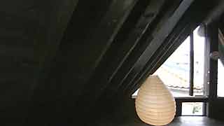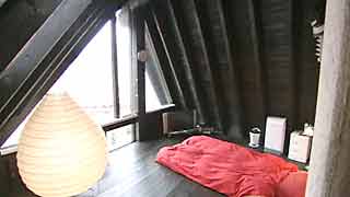 3階は、現在主寝室として使われている広間。屋根の形そのままの屋根裏部屋感覚。3本の丸太で組み上げられた登り梁に迫力を感じます。壁面は和紙貼り。 |