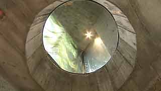 同じく3階に水回り。浴室の壁の上半分は檜、下半分と床、浴槽は御影石貼り。ガラスの天井を透かして、ここからも迫力ある丸太の登り梁が見えます。 |