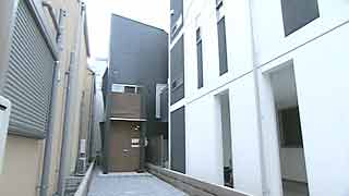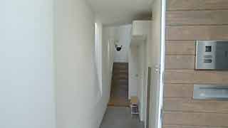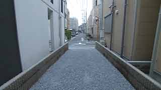 アプローチ部分を除いて四方を隣家に囲まれた旗竿形敷地。車が縦に2台置ける長いアプローチは砂利敷きです。仕事部屋への出入りし易さを考慮して、玄関土間を広くとっています。 |