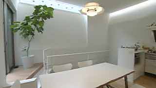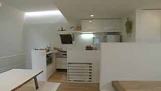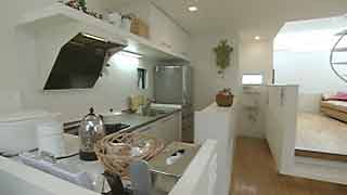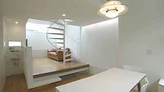 2階はワンルームのLDK。リビングとダイニングの間は小さな段差で緩やかに間仕切ります。上方から光を採り入れる『フラップ窓』が、囲まれた敷地でプライバシーを守りつつ室内を明るくします。 |