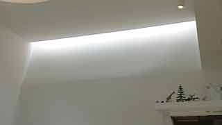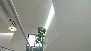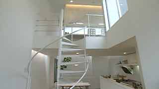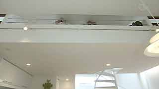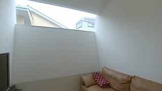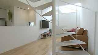 ダイニングから約40センチ床を高くしたリビング。ここも『フラップ窓』効果で、1日中安定した光が入ります。吹き抜けを介して3階とも繋がります。 |