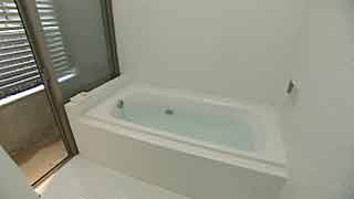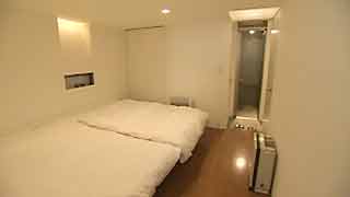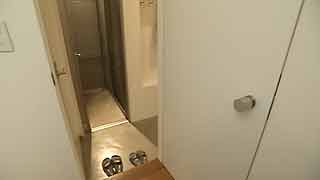 1階奥の寝室にも小さな『フラップ窓』が設けられています。隣接する水回りには、寝室を通らずに出入りできる動線も確保されています。 |