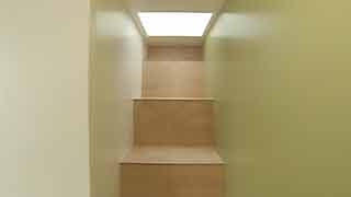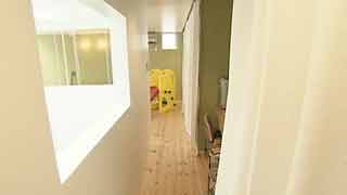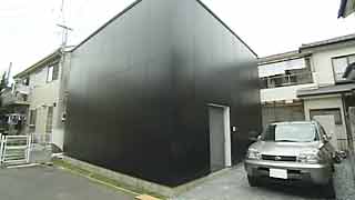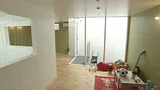 | 敷地は、郊外のやや密集した住宅地の袋小路に面している。 駐車のしやすさと、北側隣地の住宅への影響を考えると、建物位置とボリュームは必然的に決まるほどの大きさの敷地である。 「真四角の黒い箱」「生活感を思いっきり出して住まいたい」 「子供にはそこら自由に絵を書かせることになるから、室内は白いキャンバスの感覚でよい」 「ノイジィーな音楽を家中に鳴らすので、仕切りはいらない」「お風呂とトイレはあればいいぐらいの感じ」 「家族3〜4人がだらっと寝る寝床」「とにかく僕らが化粧をしていきながら住んでいければいい」 外殻は「黒い真四角の箱」という絶対的なリクエストがあったので、 敷地から駐車スペースを差し引いた残りのスペースで出来うるボリュームの中で模索していった。 平面約7m×7m×高さ5.5mという、諸条件から削り取って出来たボリュームを定め、そこから内部を構築していく作業となった。 建物の中心に2.5m四方の2層吹抜けの空間を設け、その吹抜け空間の天井に大きなトップライトを設けた。 電動で全開するこのトップライトがこの住宅の心臓といってよい。 玄関を入ってすぐ上を見上げると、切り取られた空が見え、天井からなにやらいろんなモノがぶら下がって宙に浮いている。 風が動けばそよそよと揺れだす浮遊物たちを、廻りを取り囲むように配置された各部屋から楽しむのである。感じるのである。 吹抜け壁面に穿たれた大小の開口から家族のコミュニティーが生まれる。 すべては、この吹抜けに繋がっている。 |