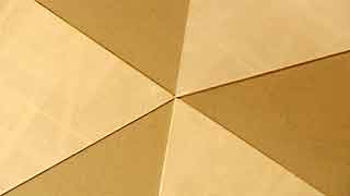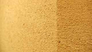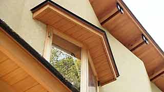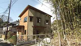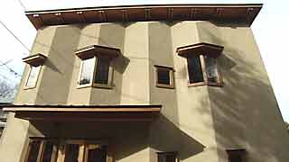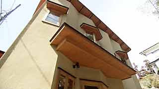 竹林に面した東面の外壁は土壁風に見えるモルタル掻き落とし仕上げ。ギザギザと屏風状になっています。窓の庇や建具も屏風状の壁に合わせ「へ」の字形になっています。 |