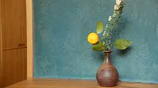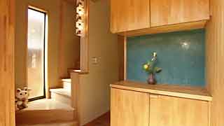 玄関は、ポーチから土間は大谷石に似た質感の関東石(中国産)敷き。正面の青い壁は、漆喰クリームに大理石粉を混ぜて塗って磨き上げた「イタリア磨き」と呼ばれる仕上げです。 |