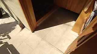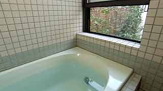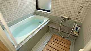 洗面室の出入り口は押しても引いても開くスウィング・ドア。浴室は床の一部にヒノキの簀の子を張っています。入浴しながら裏庭の植栽が楽しめます。 |