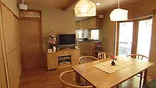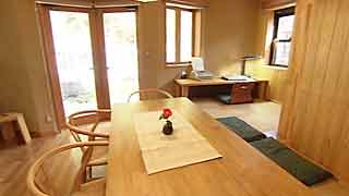 1階LDK。東面の壁は外壁の形を反映して屏風状。割竹を組んだ「竹小舞(たけこまい)」と呼ばれる下地に藁入りの土を塗った伝統的な土壁です。小上がりは奥さんの書斎。 |