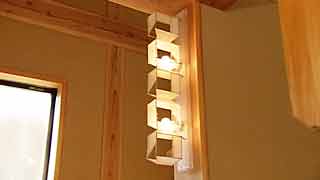 屏風壁にデザインを合わせた照明器具、食卓、スタッキングスツールは、建築家である建主の息子さんが設計し自らの手で製作した物。 |