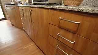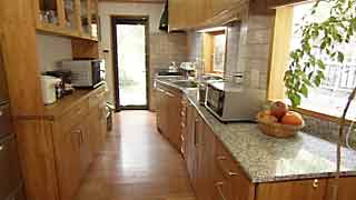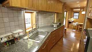 屏風壁に合わせて台所カウンターも雁行します。天板は御影石。たっぷち採られた収納の扉も息子さんが製作した物だそうです。 |