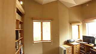 2階の天井は土壁と和紙でパターンを描いています。和紙部分は、やはり息子さんが自ら施工しました。2部屋のうち南側はご主人の書斎。 |
