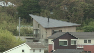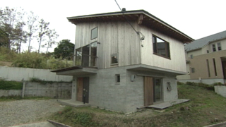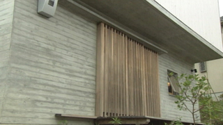 海にも近い雛壇状の住宅地にたつ1階RC造、2階木造の住宅。コンクリート打ち放しの外壁は“杉板写し”仕上げで2階の杉板張りと統一感を出しています。 |