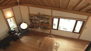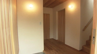 2階の壁は漆喰仕上げ。下地は伝統的な竹小舞に土壁を塗った物。竹小舞の工事には建主ご夫婦も参加しました。ホールのような空間はオーディオの響きも良いそうです。 |
