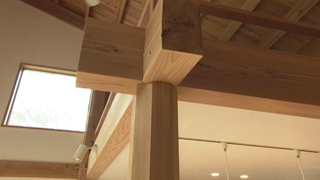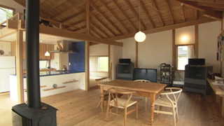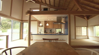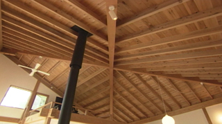2階はワンルームのLDKと和室。広さは約32畳。鳥が翼を広げたような屋根の構造を現しにしたダイナミックな空間です。棟木と登り梁以外は全て東京産の杉材を使用。 |