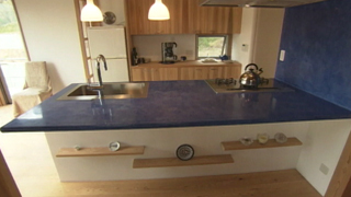 対面式の台所カウンターは青色の漆喰研ぎ出し仕上げ。緑豊かな景色を楽しみつつ作業できる位置です。上部のロフトを支える柱は8角形断面。 |