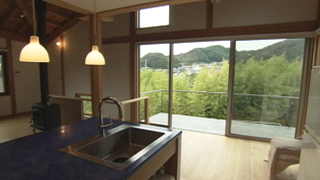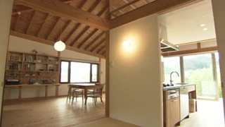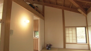 和室は普段はLDKと一体、時には障子を閉じて個室として使用する空間。上部が抜けているので天井の木組みを楽しめます。北側にはベランダがあり、山の空気を感じられます。 |