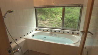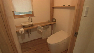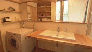 洗面所のカウンターにも東京産の杉板を使用。浴室の床・壁はタイル張り、天井は桧縁甲板張りです。トイレも壁を面によって塗り方を変えるなど職人の技を感じられます。 |