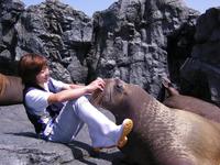 セイウチのぽんたと飼育係の村上郁代さん、「うみたまご」外観