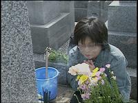最高裁での勝利判決を父母の墓前に報告する関西水俣病訴訟原告・小笹恵さん