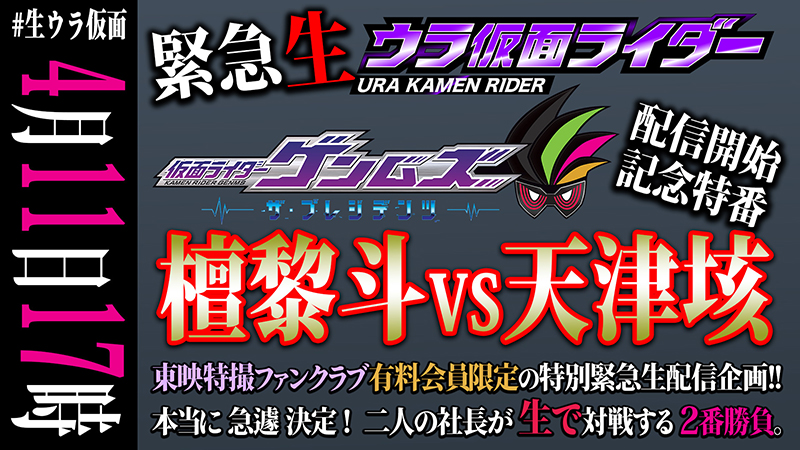 4月11日(日)10:00に配信開始となる話題作『仮面ライダーゲンムズ ─ザ・プレジデンツ─』を記念して、緊急『生ウラ仮面ライダー(#生ウラ仮面)』がTTFC会員限定で編成されることが決定! 同日の4月11日(日)17:00から生配信が2部構成でスタートします。