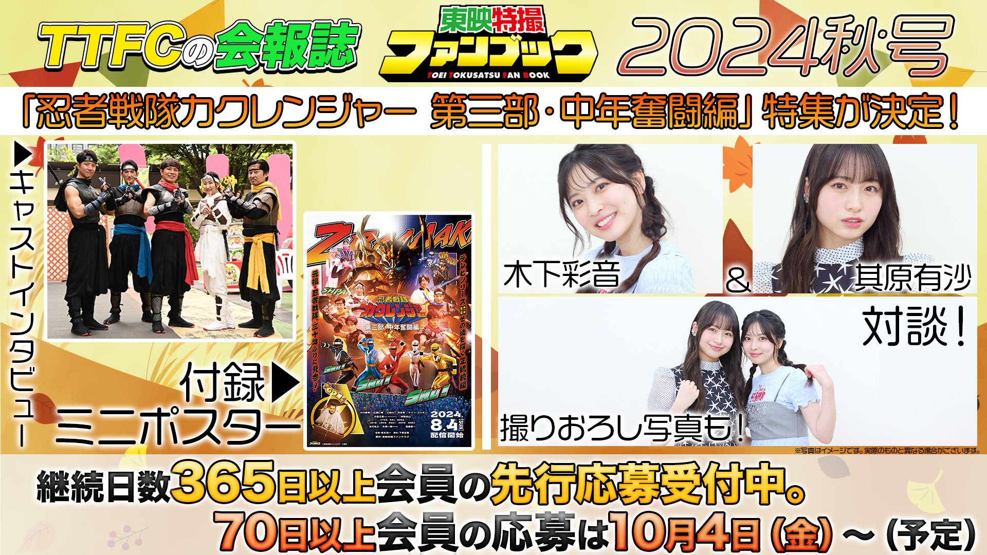 東映特撮ファンブックについての詳細は、この記事のリンクもしくは8月2日(金)のアプリ内記事「東映特撮ファンブック2024年秋号先行申込開始!「デカwithトンボ」「カクレンジャー」を特集予定!」をご参照ください。