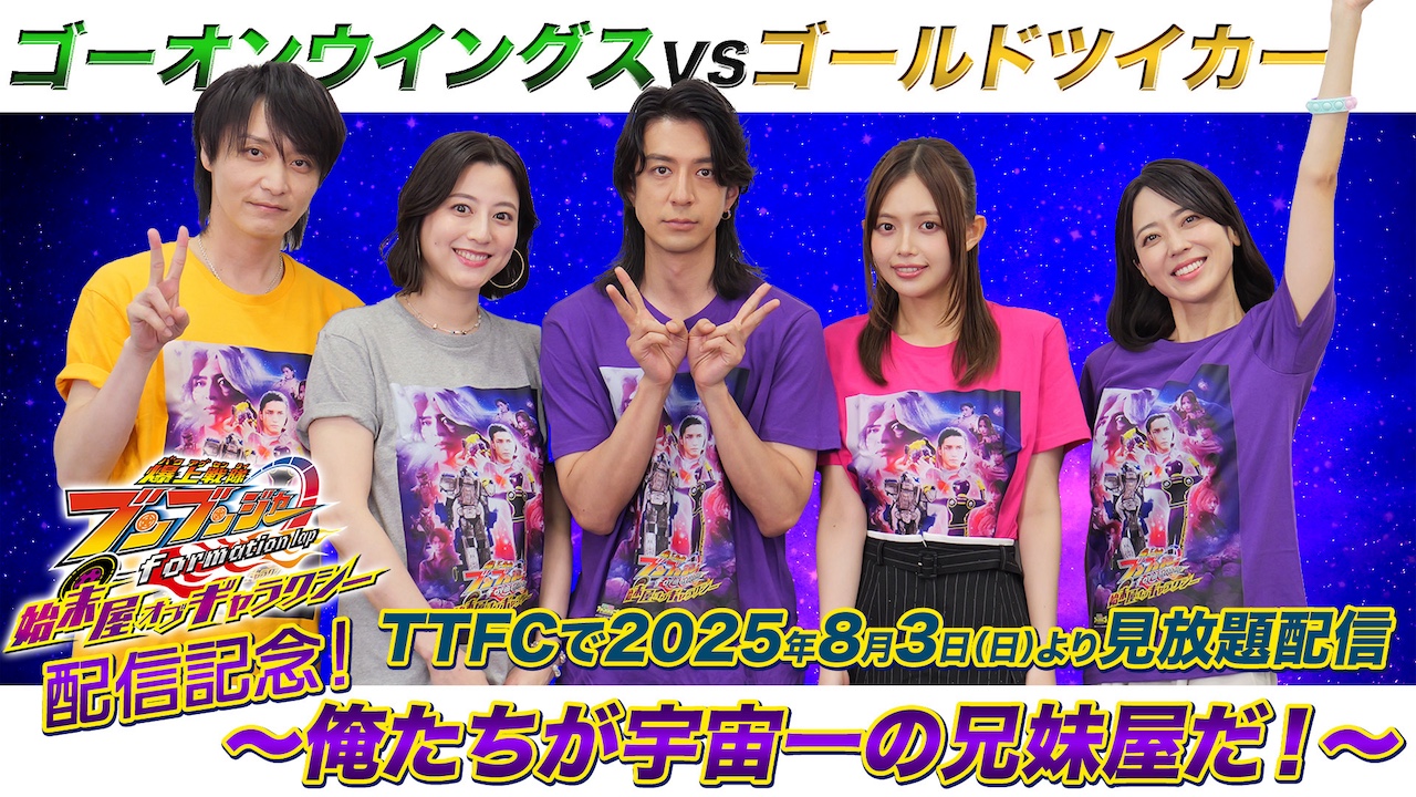 東映特撮ファンクラブ(TTFC)で大好評配信中の『爆上戦隊ブンブンジャー formation lap 始末屋 オブ ギャラクシー(=始末屋oG)』を記念して、超豪華な特別番組『ゴーオンウイングスVSゴールドツイカー~俺たちが宇宙一の兄妹(きょうだい)屋だ!~』が、明日8月3日(日)午前10時よりTTFC会員見放題配信!