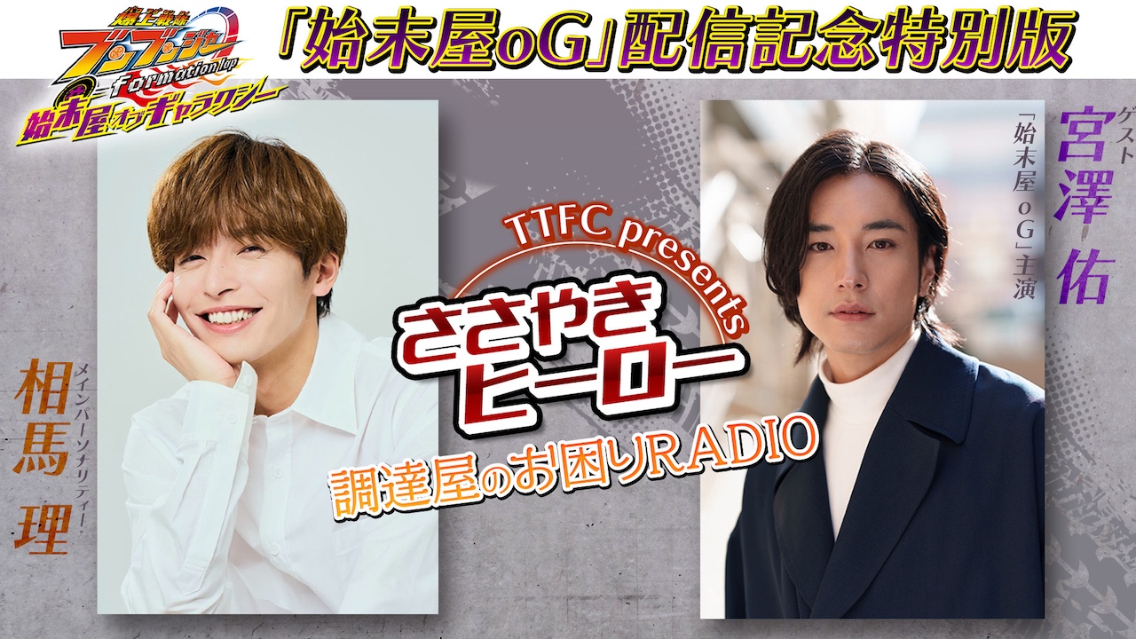 『始末屋oG』配信を記念した『ささやきヒーロー 調達屋のお困りRADIO』特別版! メインパーソナリティーは相馬理、ゲストとして『始末屋oG』の主演を務める宮澤佑が出演。『始末屋oG』の見どころや撮影時のエピソードを紹介する他、『爆上戦隊ブンブンジャー』の思い出を語ります。