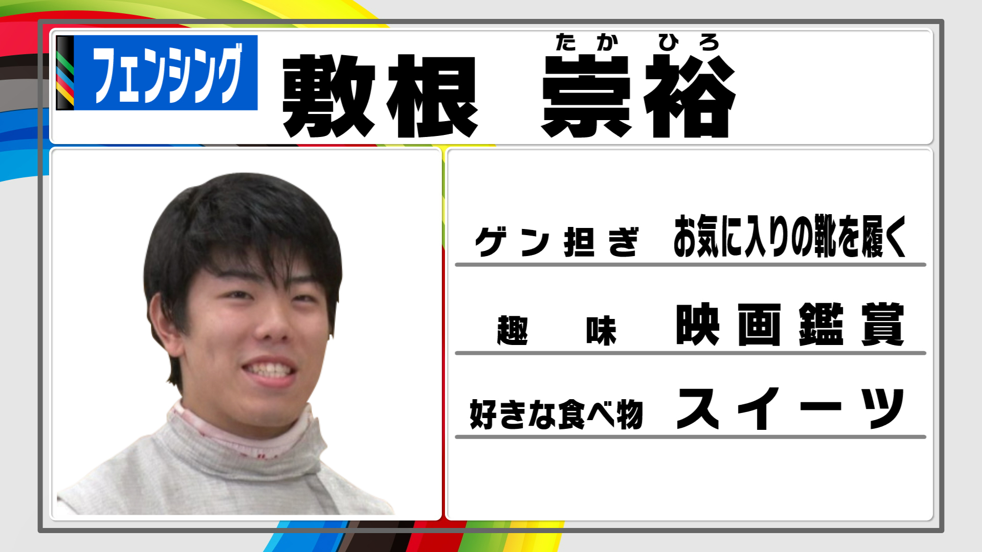 「剣先を相手に向けない」という、フェンシングの常識を覆す構え方を取り入れている敷根選手。相手との間合いを詰めることができ、リーチの長い外国人選手にも非常に有効な構えなんです。