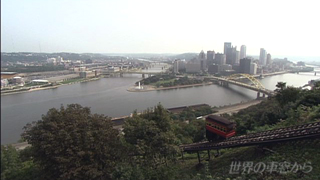 かつては製鉄工場が建ち並び 「煙の街」と呼ばれていたピッツバーグ 今では、クリーンなハイテク産業の街に 生まれ変わりました 山の上から眺めてみましょう 1877年に開業したインクライン 料金は片道200円ほど 毎日、朝早くから夜中まで動いていて ダウンタウンと山の上を結ぶ 市民の大切な生活の足になっています 2つの川が合流する三角州に 世界的な企業やホテルの高層ビルが林立する ピッツバーグの中心街は 「黄金の三角地帯」と呼ばれています |
