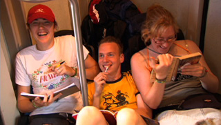 ノルマンディ、東の中心、ルーアンと 西の中心、カーンを結ぶ、この列車 意外と混んでいて、座るところがない人もいます 三人は友達同士、ベルギーから来たそうです こんなところに乗るのも、旅の楽しさのうち・・と、前向きな姿勢です こちらは、ドイツから旅行に来た二人 あちこちの国に、鉄道で簡単に行けるというのは、 何だか・・ うらやましいです |