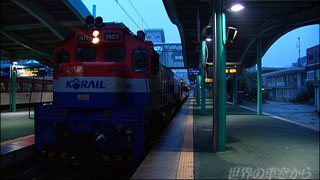 雨上がりの木浦(モッポ)駅 午前6時を前に、ムグンファ号が出発します 韓国南部を走る慶全(キョンジョン)線 終点釜田(プジョン)駅までおよそ400キロの道のりです 見送りもいないホームから、静かに旅立ちます 窓を濡らす雨粒だけが 別れを惜しんでいるようです