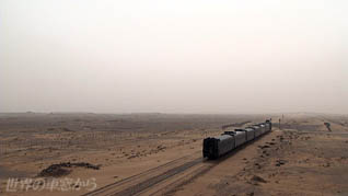 列車は砂漠の真ん中でストップ 対向列車を待ちます この時間を利用して運転士にお茶と お菓子を運ぶ乗務員
