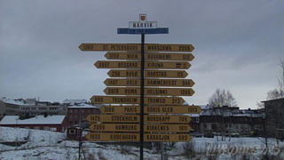 ノルウェー海から内陸に入り込んだ オフォート・フィヨルド その畔にナルヴィークの町があります 北極点まで2407キロ 町の広場にはこの北の港町から ヨーロッパの主要都市までの距離が記されています 主だった所ではローマまでは3978キロ パリまで3189キロです この町が発展し始めたのは、20世紀初頭 キールナで採掘された鉄鉱石を運ぶ鉄道が 開通してからのことでした メキシコ湾流の影響で真冬でも凍らない入り江は 鉄鉱石の積出港としてうってつけだったのです ヨーロッパ最北の駅を列車が出て行きます |