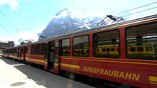 ユングフラウヨッホを目指す旅も いよいよ最後の路線になりました 標高3454メートル、ヨーロッパでもっとも高い鉄道駅に向かって 1393メートルの標高差を登るのが このユングフラウ鉄道です もちろん、ここでも急勾配を登るために歯車の力を使います 巨大な岩の壁に向かって 列車はぐんぐんと登っていきます |