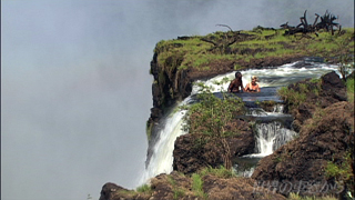 世界三大瀑布のひとつヴィクトリア・フォールズ アフリカ南部の大河ザンベジ川が 幅1.7キロに渡って轟き落ちる様は まさに壮観のひと言! …のはずなんですが まだ雨季に入ったばかりとあってちょっと迫力に欠けています ところが! 水量の少ないこの時期だからこそできることもあるんです ザンベジ川を泳いで渡っていくこの人たち… 心配そうに見守る夫をよそに 妻とガイドの二人はどんどん進んでいきます その目指す先にいったい何があるのでしょう? 「デビルズ・プール」と呼ばれるそこは ヴィクトリア・フォールズのまさに崖っぷち すぐ目の前では 100メートル下へと 川がうなりを上げて落ちていきます うーん身をもって感じる大自然の迫力… 「やっぱり俺も行けばよかったかな」とつぶやく夫 …とこのように滝を堪能したあとには 蒸気機関車の旅も待っています |