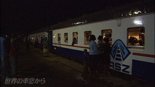 キトウェに向う列車の出発は午後8時 荷物で順番を取って 乗客たちは待ち続けます やがてあたりも薄暗くなったころ いよいよ乗車に向けて ずらりと人々が並びました 乗車が開始されたのは 出発1時間前の午後7時 窓から荷物を放り込んで 座席を確保…? それって…アリなんですか? おや人間もついでに? 大きな荷物を網棚にあげて ようやく一息 ホームのここかしこでは 駅らしい別れの光景が展開されています |