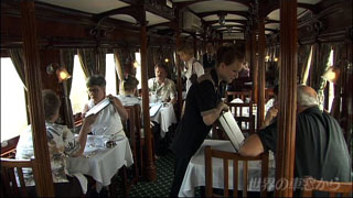 ヴィクトリア・フォールズを出発してからおよそ2時間 午後1時からのランチタイムを前に 厨房が忙しくなってきました これはなかなか立派なロブスターですね オーブンの中ではパンが焼き上がってきました ロボスレイルの料理は 一流レストランにひけをとらないと評判です 車内に響く鉄琴のメロディ これがランチタイムを知らせる合図です 食堂車に乗客が集まり ランチタイムが始まりました 先程厨房で見た一皿 この日のメインのひとつ シェフの特製サラダです こちらはフィロと呼ばれる地中海料理 メインはこの他 牛のフィレや魚料理からの選択となっています |