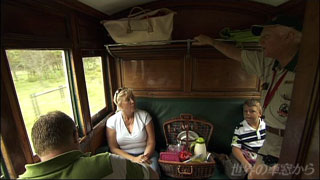 ポート・エリザベスの郊外を走るアップル・エクスプレス こちらは、ボランティアの一人ピーターさん 元々農業を営んでいましたが この列車に愛着を感じ 1993年から運営に参加しています 「客車は、殆どが20世紀初頭のものですよ」 乗客たちに説明をして回ります 窓の外をのんびりとした風景が流れていきます おや、お弁当ですね お昼にはちょっと早いようですが 列車の旅にはお弁当がかかせません 乗客たちの笑顔を乗せて アップル・エクスプレスは走りつづけます |