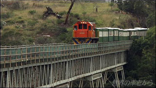 線路幅610ミリのナローゲージ アップル・エクスプレス 駅でもないところで一時停車です 列車を降りた乗客たちの前に姿を現したのは ファン・スターダンス川に架けられた鉄橋でした 乗客たちは歩いて渡ります 1904年に完成したというこの鉄橋は 高さ78メートルで ナローゲージとしては世界一の高さを誇っています 乗客たちは、鉄橋を渡る列車の勇姿を見つめます ファン・スターダンス川の鉄橋を後に 走り始めたアップル・エクスプレス 乗客たちの顔に笑顔がこぼれます |