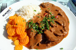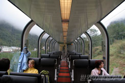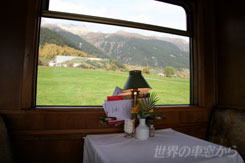 「撮影日誌5」 それにしても、スイスにおける「エキスプレス」っていったい…?実際、氷河急行ことグレッシャー・エキスプレスなんかは「世界一遅いエキスプレス」などと自虐ネタにしているくらいだけど、まったく速くない。区間によっては普通列車を連結して走っているので、停車駅すら実質変わらない場合もある。 さらに「急行」という意味とは全然違う使い方もあるみたいで、後日乗る予定のモンブラン・エキスプレスはまったくの普通列車だし、サンベルナール・エキスプレス、ラーゴ・マッジョーレ・エキスプレス、ウィリアムテル・エキスプレスなどは「列車+バスや船のセット」を指すようだ。まあ、別にいいけど。ちょっと誤解を招きますな。 そりゃね、時速240kmとかでサン・モリッツからツェルマットまで行かれても、嬉しくはないですよ、ええ。標準軌で、直線の線路敷いて、直線のトンネルたくさん掘って、なんてねえ。誰も望んじゃおりません。 さて、氷河急行だが、このパノラマ車両はベルニナ急行にちょっと負けている。まず、一枚ガラスではなく、横と斜め上の二枚のガラスに分かれているので「山の上まですっぽり」は入らない。また、ブラインドがないので日差しが強い時はちょっと辛い(でも景色を見たいわけだから、どのみちブラインドは使わないんだけど)。 そしてスイスを代表する名物列車も、鉄道離れという時代の影響もあるのか、様々な変更もあるようだ。例えば、停車駅を減らす方向で進めているらしく、昔の停車駅で今は止まらないところがいくつもある(その点は「エキスプレス」的と呼べる発展かも?)。昼食は、食堂車ではなく、座席で食べる方式も取り入れられており、これも多分賛否の分かれるところだろう。 よく「氷河なんか見えない」という評も見かけるけど、見えないわけではない。もちろん、最大の目玉だったローヌ氷河は新フルカトンネル開通のために見えなくなって久しいわけだし、7時間半も乗っている割には氷河が少ないという感想はあると思うけど。でも、ベルニナ急行もそうだけど、氷河って見下ろすアングルでないと、あまり有難みが感じられないんじゃない?普通、鉄道は尾根には敷かないので、仰ぎ見るようなことになるわけで、氷河の先端が見えるだけという感じになってしまうのは、いたしかたのないところ。 でも、スイスを観光する上で、氷河急行がとても優れた手段のひとつであることは間違いない。
